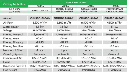 Model ORKSDC-8604A ORKSDC-8604A1 ORKSDC-8606B ORKSDC-8606B1 Air Flow 4,500 m³/hr 6,800 m³/hr 6,500 m³/hr 9,500 m³/hr Motor Power 5.5 kw 7.5 kw 7.5 kw 11 kw Voltage 380V/50Hz. 380V/50Hz. 380V/50Hz. 380V/50Hz. Filtering Material Polyester+PTFE Polyester+PTFE Polyester+PTFE Polyester+PTFE Filtering Area 60 m³ 60 m³ 90 m³ 90 m³ Filtering Efficency >99.9% >99.9% >99.9% >99.9% Filtering Precision ≤0.1 um ≤0.1 um ≤0.1 um ≤0.1 um Number of Filter