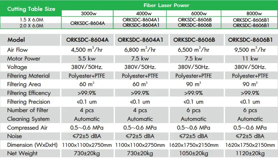 Model ORKSDC-8604A ORKSDC-8604A1 ORKSDC-8606B ORKSDC-8606B1 Air Flow 4,500 m³/hr 6,800 m³/hr 6,500 m³/hr 9,500 m³/hr Motor Power 5.5 kw 7.5 kw 7.5 kw 11 kw Voltage 380V/50Hz. 380V/50Hz. 380V/50Hz. 380V/50Hz. Filtering Material Polyester+PTFE Polyester+PTFE Polyester+PTFE Polyester+PTFE Filtering Area 60 m³ 60 m³ 90 m³ 90 m³ Filtering Efficency >99.9% >99.9% >99.9% >99.9% Filtering Precision ≤0.1 um ≤0.1 um ≤0.1 um ≤0.1 um Number of Filter