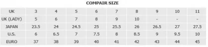 UK 3 4 5 6 7 8 9 10 11 UK (LADY) 5 6 7 8 9 10 – – – JAPEN 23.5 24 24.5 25 25.5 26 26.5 27 27.5 U.S. 6 6.5 7 7.5 8 8.5 9 9.5 10 EURO 37 38 39 40 41 42 43 44 45 - Gallery