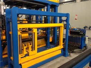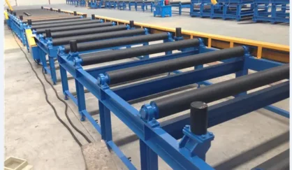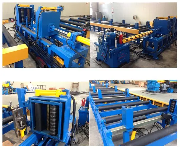 ลูกกลิ้งจะหมุนโดยมอเตอร์และตัวลดความเร็ว บ่งบอกถึงชิ้นงานไปยังเครื่องหลัก มีอุปกรณ์ประคองไฮโดรลิคทั้งสองด้านของลูกกลิ้งซึ่งสามารถเปิดและดูดซับแผ่นปีก ไปยังลูกกลิ้งแม่เหล็กเพื่อเปลี่ยนรูปแบบจากแผ่น เป็นรูปร่าง H