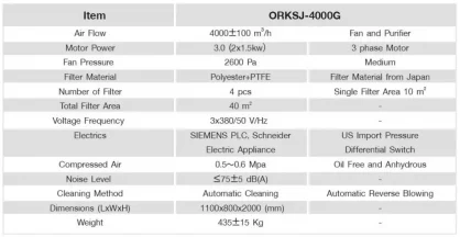 Cutting Table Size Laser Power 1.5 x 3.0 M 1000w 2000w 3000w 4000w 1.5 x 6.0 M 1000w 2000w 3000w 2.0 x 3.0 M 1000w 2000w 3000w 2.0 x 6.0 M 1000w 2000w Item ORKSJ-4000G Air Flow 4000±100 m³/h Fan and Purifier Motor power 3.0 (2×1.5kw) 3 phase Motor Fan Pressure 2600 Pa Medium Filter Material Polyester+PTFE Filter Material from Japan Number of Filters 4 pcs Single Filter Area 10 m² Total Filter Area 400m² – Volyage Frequency 3×380/50 V/Hz – Electrics SLEMENS PLC , Schneider Electric Appliance US Import Pressure Differential Switch Compressed air 0.5∼0.6 Mpa Oil Free and Anhydrous Noise Level ≤75±5dB(A) – Cleaning Method Automatic Cleaning Automatic Reverse Blowing Dimensions (LxWxH) 1100x800x2000 (mm) – Weight 435±15 Kg – - แกลลอรี่