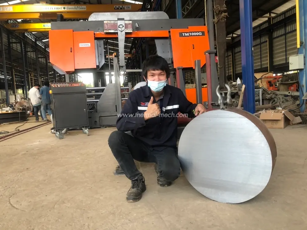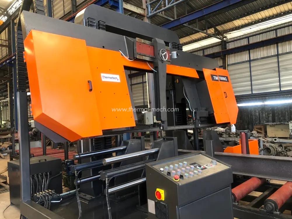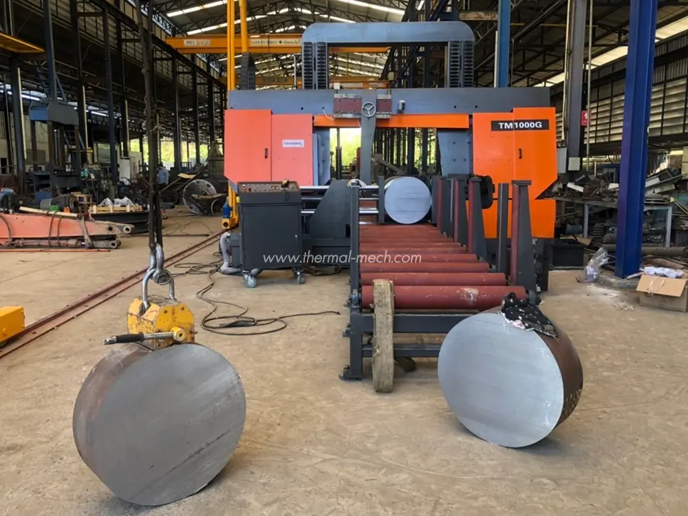 เครื่องเลื่อยสายพานกึ่งอัตโนมัติขนาดใหญ่ Thermatech TM-1000G รองรับสำหรับการตัดชิ้นงานที่เป็นท่อกลม เพลาตัน ได้ถึงขนาดเส้นผ่านศูนย์กลาง 1 เมตร รวมทั้งชิ้นงานโปรไฟล์ เหล็กกล่องสี่เหลี่ยม เหล็กฉาก เหล็กรางน้ำ ชิ้นงานหล่อ ตีขึ้นรูป ท่อคาร์บอน สแตนเลส เหล็กกล้าทนความร้อนรวมทั้งโลหะผสมไททาเนียม