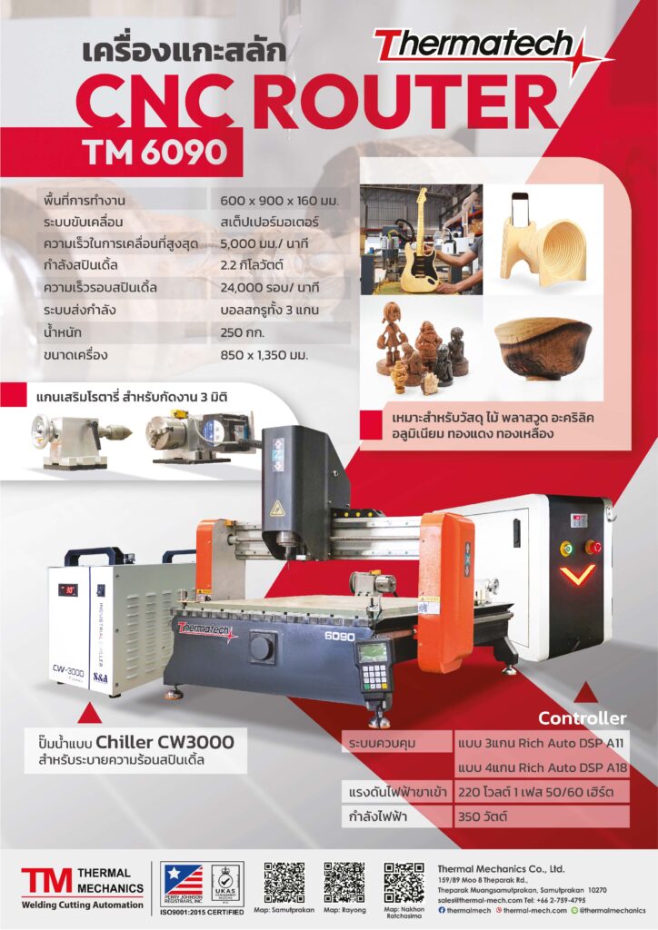เครื่องตัดและแกะสลักควบคุมด้วยระบบ CNC  (CNC Router)  Thermatech  รุ่น TM 6090-2.2KW   เป็นเครื่อง  CNC Router  ขนาดเล็ก มีพื้นที่ทำงาน ขนาด  60×90 ซม. ขับเคลื่อนระบบ 3 แกน  ออกแบบกระทัดรัด สำหรับงานตัดและแกะสลักวัสดุ ไม้ พลาสติค แผ่น พลาสวูด งานตัดแผ่นอะคริลิค  อลูมิเนียมคอมโพสิท งานแกะสลักไม้ งานทำป้ายจากไม้  สามารถกัดวัสดุโลหะอ่อน เช่นทองแดงหรืออลูมิเนียมได้  สะดวกต่อการใช้งาน  กำลัง Spindle ขนาด  2.2 KW ระบายความร้อนด้วยน้ำ  ความเร็วรอบสูงสุด  24,000  rpm.