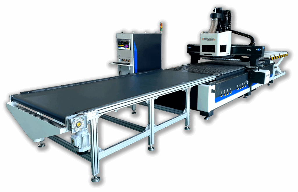 เครื่องตัดแผ่นวัสดุควบคุมด้วยระบบ CNC (CNC Router) Thermatech รุ่น TM 1325-12LUL เป็นเครื่อง CNC Router System ระบบ 3 แกน มีระบบขับเคลื่อนด้วย Fully Servo Motor ควบคุมด้วยชุดคอนโทรเลอร์แบบอุตสาหกรรม Syntec มีระบบเปลี่ยนดอกอัตโนมัติ (Auto Tool Change; ATC) ได้สูงสุด 12 แบบ ออกแบบสำหรับงานตัดวัสดุในงานผลิตเฟอร์นิเจอร์ มีระบบดึงวัสดุ (Loading Function) ขึ้นไปวางบนโต๊ะตัด และระบบดันชิ้นงาน (Unloading Function) เมื่อเครื่องตัดเสร็จแล้ว ใช้งานได้ดีกับวัสดุจำพวก ไม้ แผ่นพลาสวูด งานตัดแผ่นอะคริลิค มีพื้นที่ในการทำงานให้เลือกหลายขนาด ตามความต้องการ เช่น 1300 x 2500 มม. (1.3 x 2.5 เมตร) หรือ 1300 x 4000 มม. (1.3 x 4.0 เมตร)